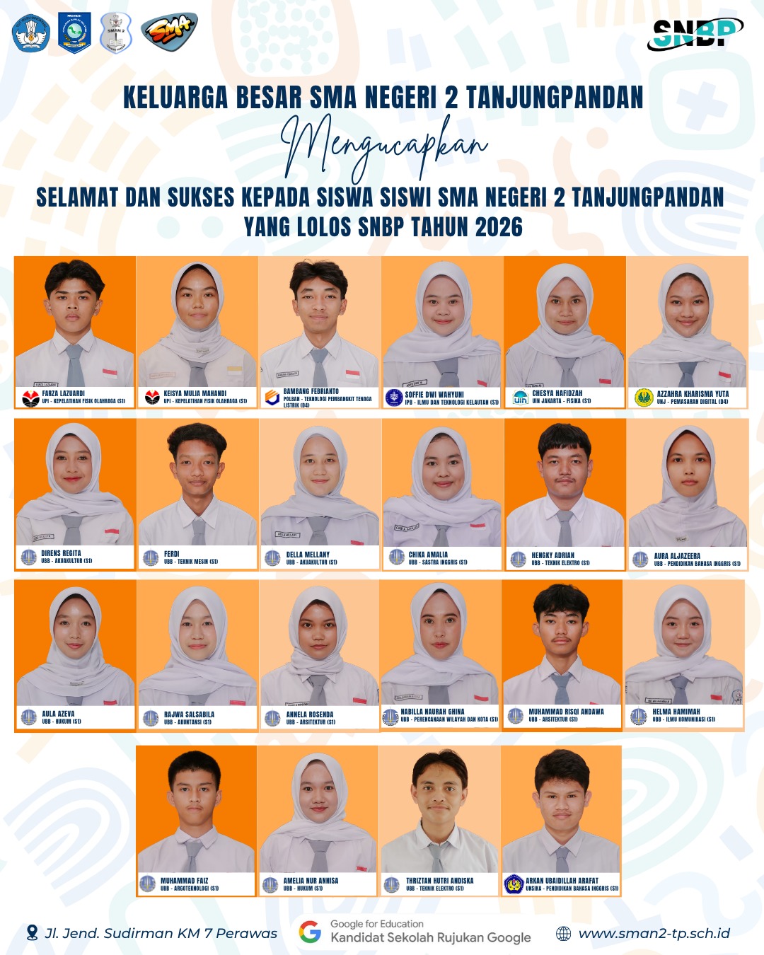 Tanjungpandan — Kabar membanggakan datang dari SMA Negeri 2 Tanjungpandan. Sejumlah siswa berhasil lolos Seleksi Nasional Berdasarkan Prestasi (SNBP) tahun 2026 dan diterima di berbagai perguruan tinggi negeri ternama di Indonesia.Keberhasilan ini menjadi bukti nyata kerja keras siswa, dukungan orang tua, serta dedikasi para guru dalam membimbing peserta didik selama menempuh pendidikan di sekolah. Para siswa yang lolos SNBP tersebut diterima di berbagai program studi unggulan, mulai dari bidang teknik, ekonomi, hingga ilmu sosial dan humaniora.